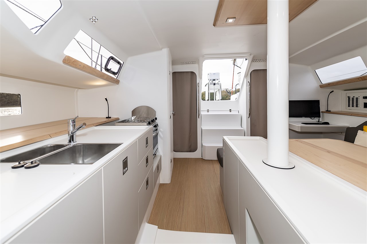 Designed by Finot-Conq and built by Pogo Structures in France, the Pogo44 benefits from the technological and design developments applied on their previous models : all around performance, robust structure, wide beam, form stability, double tillers, deep keel, carbon mast, square top main…. With voluminous shape, she offers plenty of cockpit and interior comfort, that can only be found in cruisers at least 10ft longer.